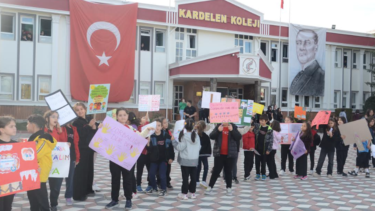 Kardelen Eğitim Kurumları İlköğretim 3. sınıf öğrencileri, akran zorbalığına dikkat çekmek için “Zorba olma kanka ol” sloganları atarak yürüyüş yaptı.
