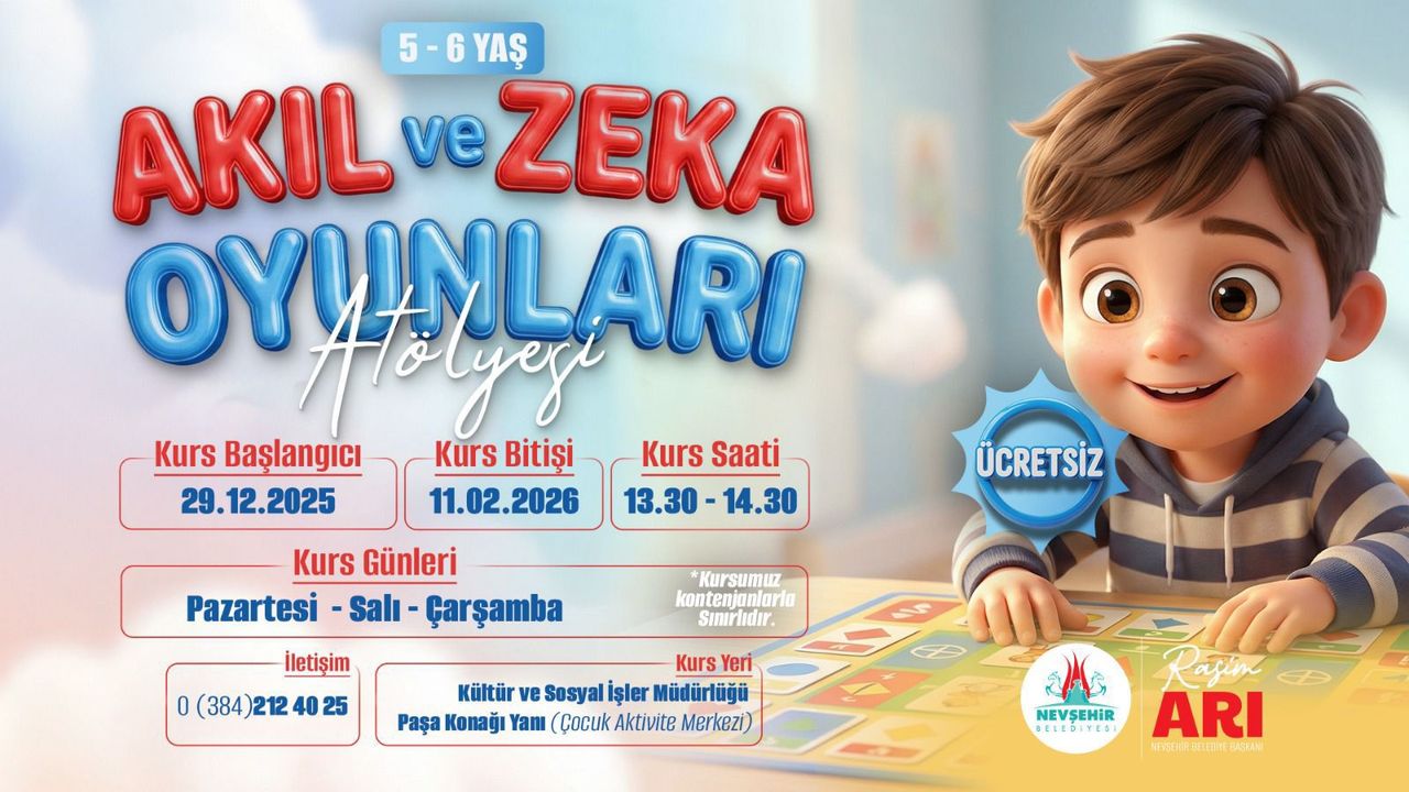 Kültür, Sanat ve Sosyal İşler Müdürlüğü tarafından organize edilecek olan Akıl ve Zekâ Oyunları Atölyesi’nin çocukların zihinsel ve fiziksel gelişimlerine katkı sağlaması amaçlanıyor.
