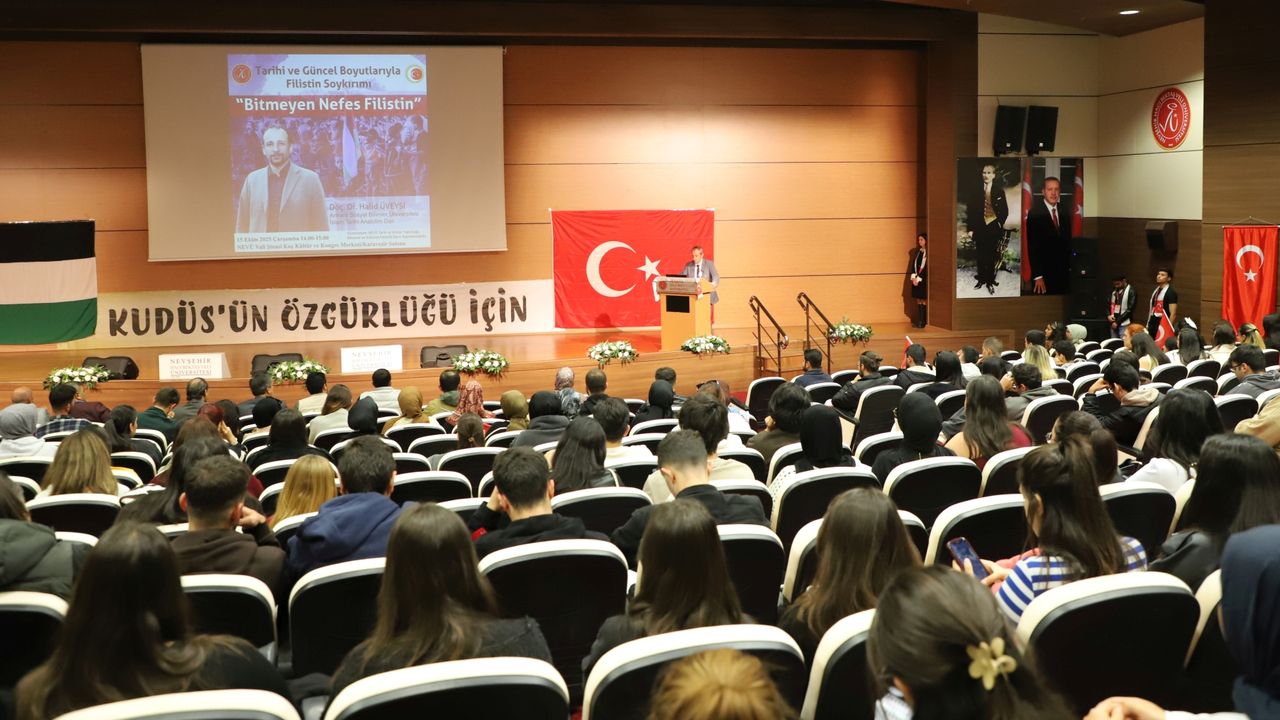 Nevşehir Hacı Bektaş Veli Üniversitesi (NEVÜ) Tarih ve Kültür Topluluğu tarafından “Tarihi ve Güncel Boyutlarıyla Filistin Soykırımı (Bitmeyen Nefes Filistin)” konulu konferans düzenlendi.